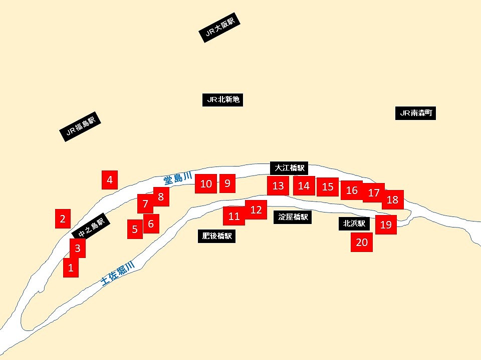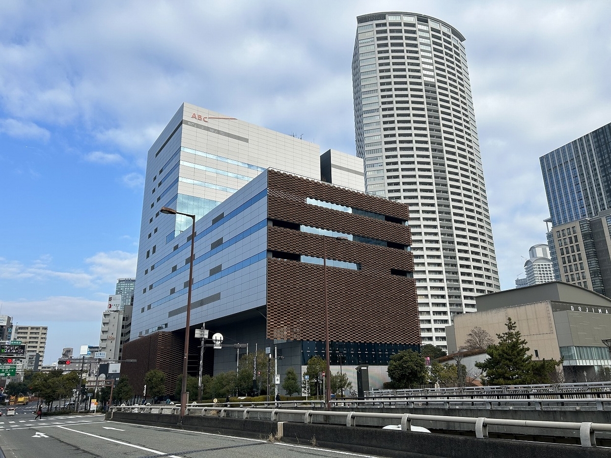リーガロイヤルホテル大阪から堂島川に沿って上流に200mほど進むと玉江橋。その橋の向こうに見える複合施設がほたるまち。A街区は「朝日放送」、B街区は高層集合住宅、共同住宅、事務所、ホールなどの複合施設、そして商業施設のC棟のざっくりいって3棟で構成されている。