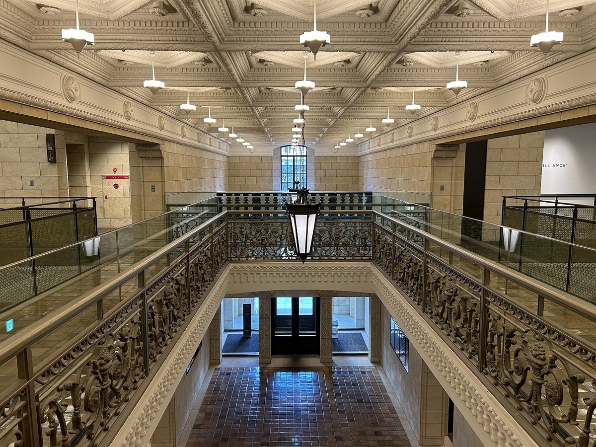 地上8階の優雅なネオ・ロマネスク様式のビルであったが、2013年に地上22階、高さ108mのビルに建て替えられた。ところが嬉しいことに、かつてのファサードをかなり忠実に残し、内装も復元するという、手間のかかる建て替えプロジェクトを実施してくれており、いまなおかつての商都大阪の面影を残していてくれる。外壁の彫刻群やエントランスの照明には目を見張るばかり。こんな手のかかった再建をしてくれるとは、大阪の方々の心意気を感じる。