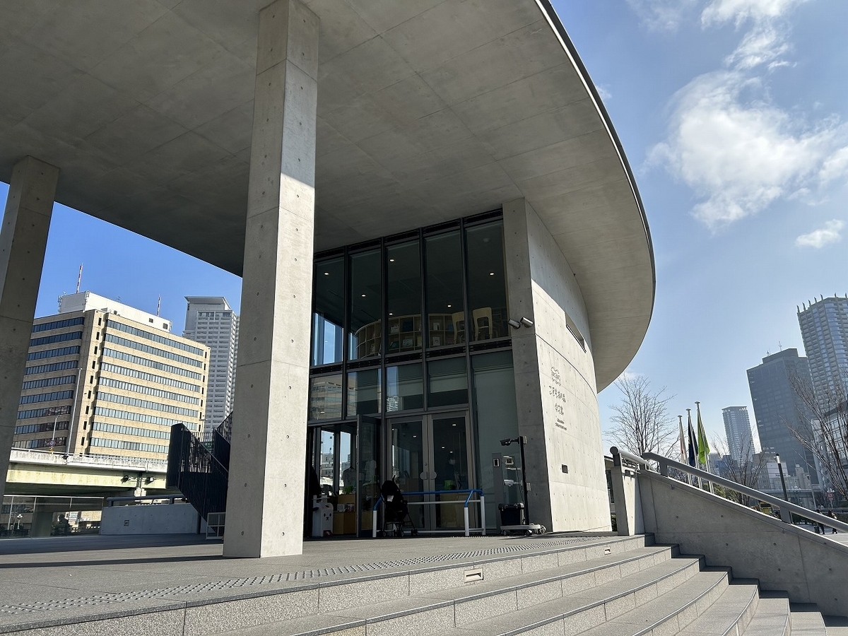 京阪中之島駅を降りた正面には、直線のみを組み合わせた巨大で無骨な方形の建物が目の前に聳える。これが大阪府立国際会議場、通称グランキューブ大阪。2000年に日本で開催されたG8サミットの誘致のために建設された。設計は大御所の黒川紀章。