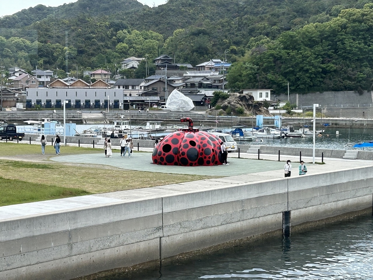 ここからまたアップダウンのある舗装路を歩いて、1時半に直島港。ターミナルもアート。